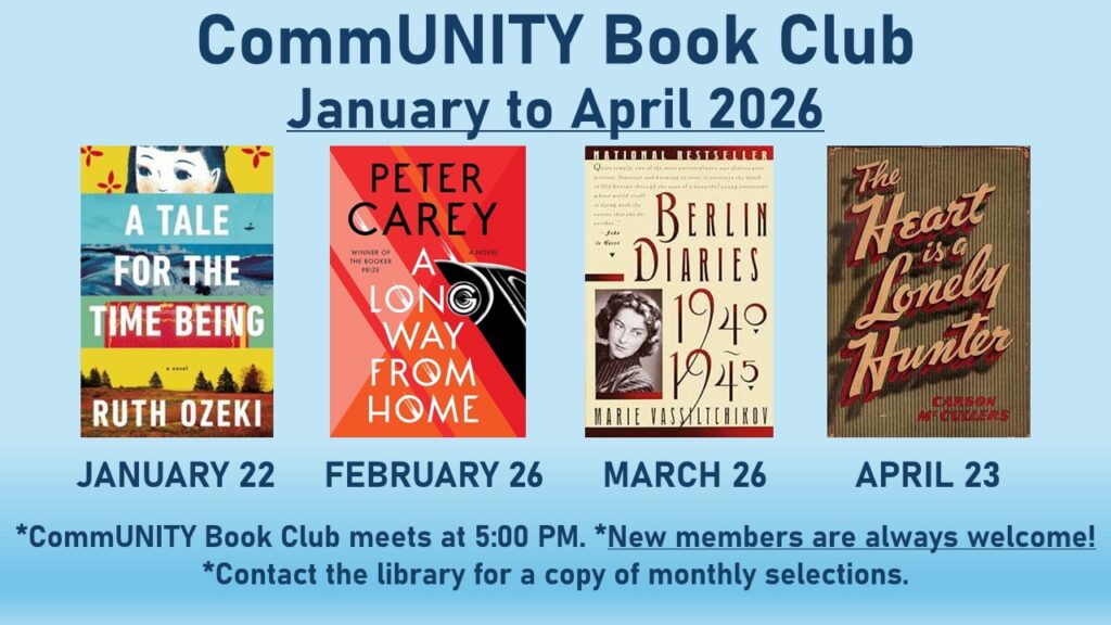 CommUNITY Book Club has been meeting for over 20 years to discuss fiction and non-fiction books and is always open to new members! Contact the library to obtain a copy of monthly picks and join in the discussions. March’s title is