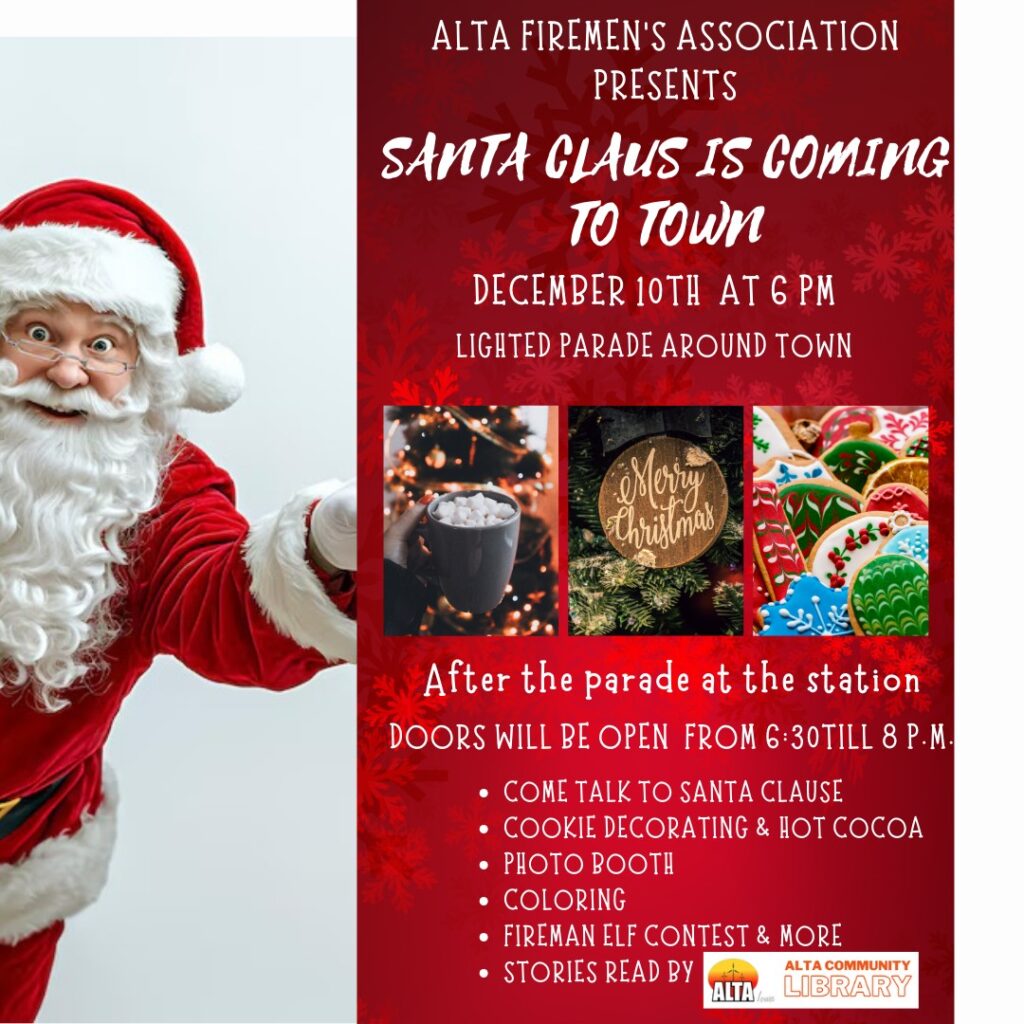 The Alta Fireman’s Association is hosting an event December 10 starting at 6 pm. There will be a lighted parade down main street and back to the station. After the parade the station will be open for kids to see Santa, decorate cookies, vote on their favorite fireman elf, story reading by the Alta Community Library and so much more!