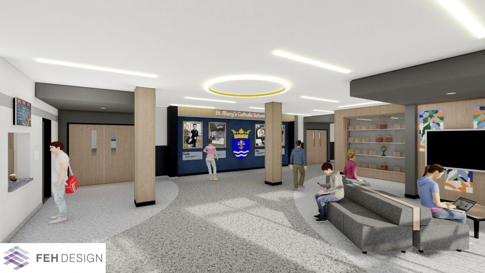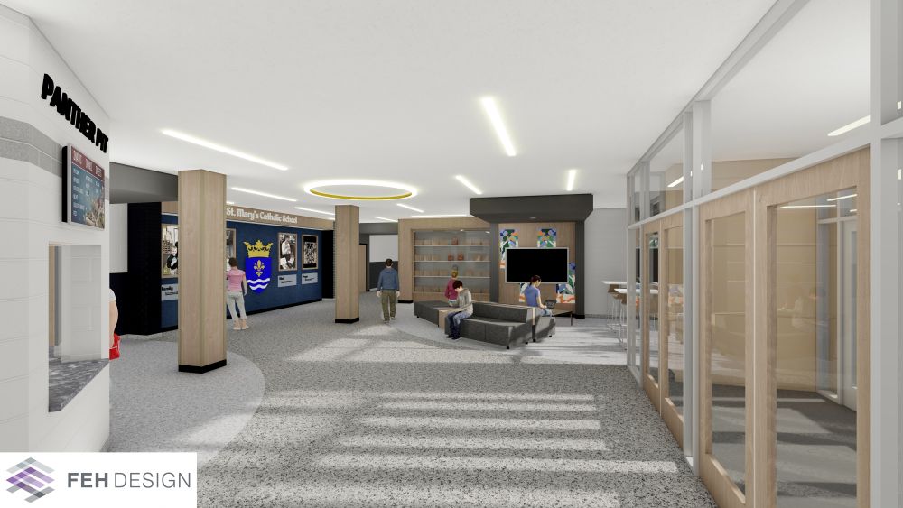 Planned improvements include relocating the coach’s office, concession stand, and restrooms, along with new paint, lockers, doors, flooring, ceilings, trophy cases, and a reconfigured west staircase. The renovations will also highlight St. Mary’s Catholic identity, with architectural renderings prepared by FEH Design showing a modernized, welcoming space.